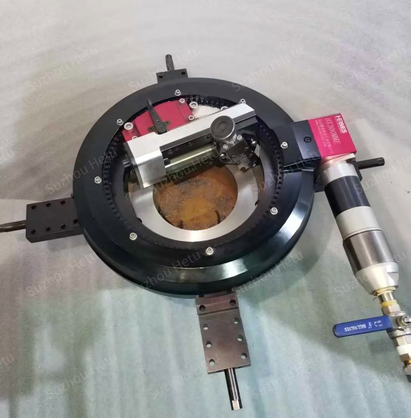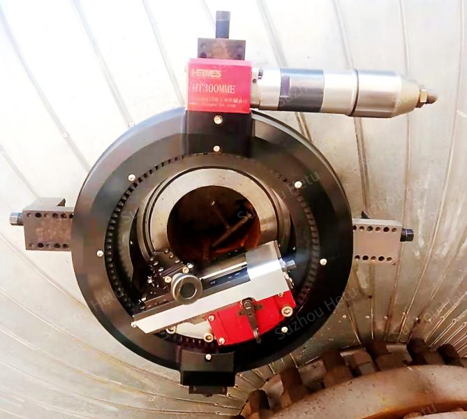 HT300MME is an externally mounted flange facing machine that clamps onto the flange outside diameter, featuring a compact design and minimal working space requirement. It is ideal for flange faces repairing in tight or confined spaces, sealing grooves machining, weld beveling, and boring holes.